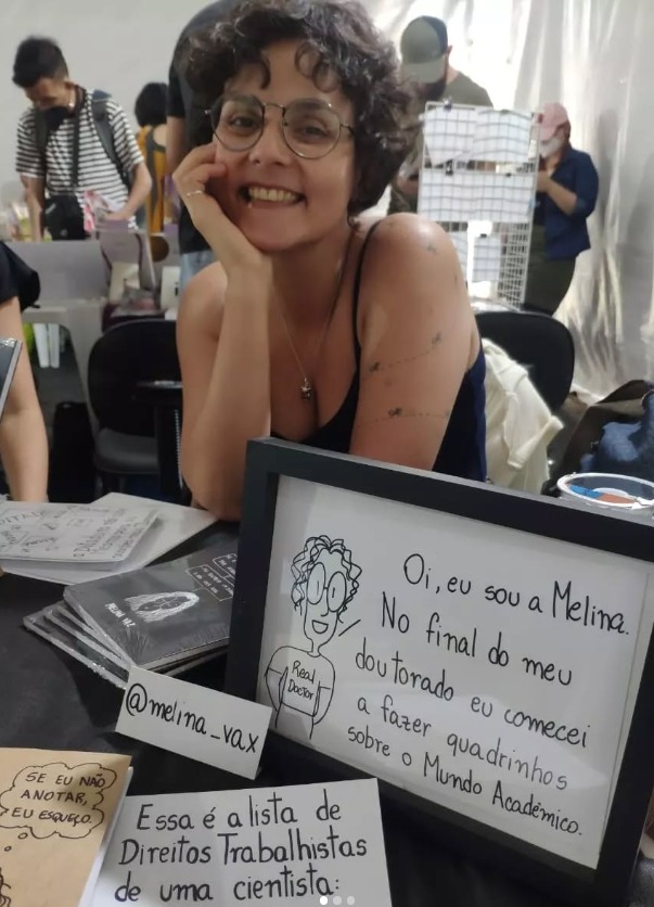 Melina Vaz, bióloga(UFF) e psicóloga(USP), atualmente professora (UENF) é autora do livro Diário de um Doutorado (2022), e possui diversos desenhos de humor que publica desde 2018 em seu perfil @melina_vax . Outras produções abrangem o zine ArteCiência: um café duplo para a gente seguir em frente(2019) e o zine Academicomics(2022), primeira produção em coautoria com Rachel Paterman, inaugurando o selo.
